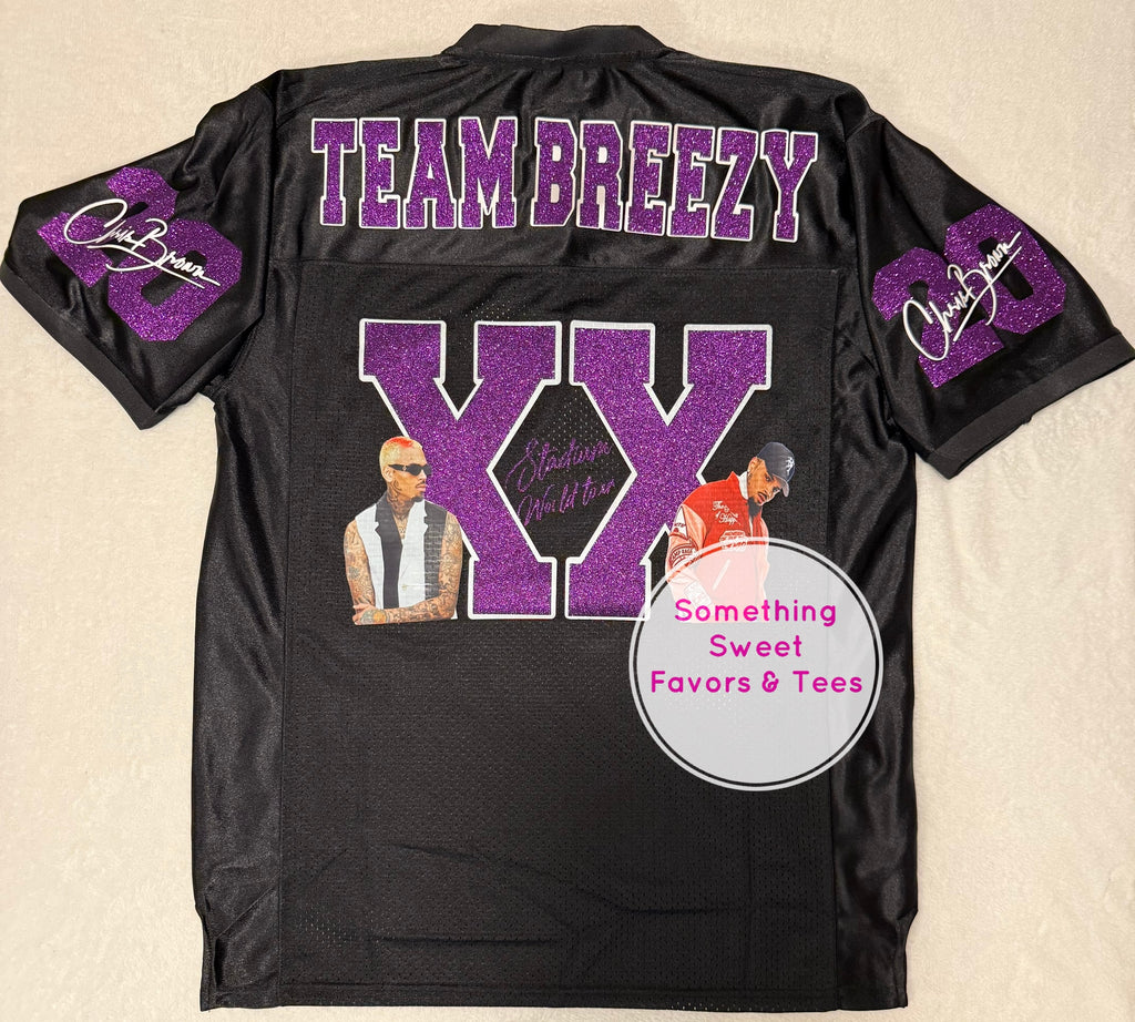 Stand out on game day, concert night, or any event with this bold Breezy Bowl Football Jersey. Designed with a sporty vibe and sparkling glitter accents, this jersey is perfect for Team Breezy fans who love to show off their style with a little extra shine.