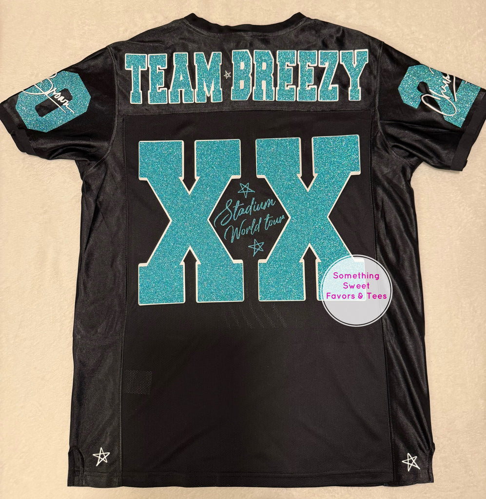 Stand out on concert night, or any event with this bold Breezy Bowl Football Jersey. Designed with a sporty vibe and sparkling glitter accents, this jersey is perfect for Team Breezy fans who love to show off their style with a little extra shine.